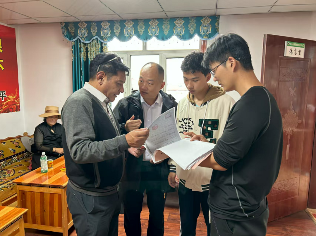 考日仁青才仁(左一)为乡亲讲解政策。青海省文明办供稿