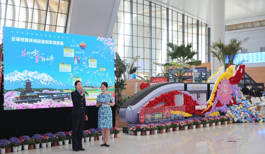 近日,由中宣部文明创建局、中央网信办网络传播局、广电总局宣传司、国铁集团党组宣传部联合举办的“我的铁路风景”主题宣传第二季活动正式启动。当天下午,昆明南站“鲜花会客厅”里,一场以“花开四季 ‘香’约云南”为主题的站车文化活动热闹上演,通过现场互动与网络直播相结合的方式,向广大旅客和网友展现了极具云南特色的“铁路风景”。
