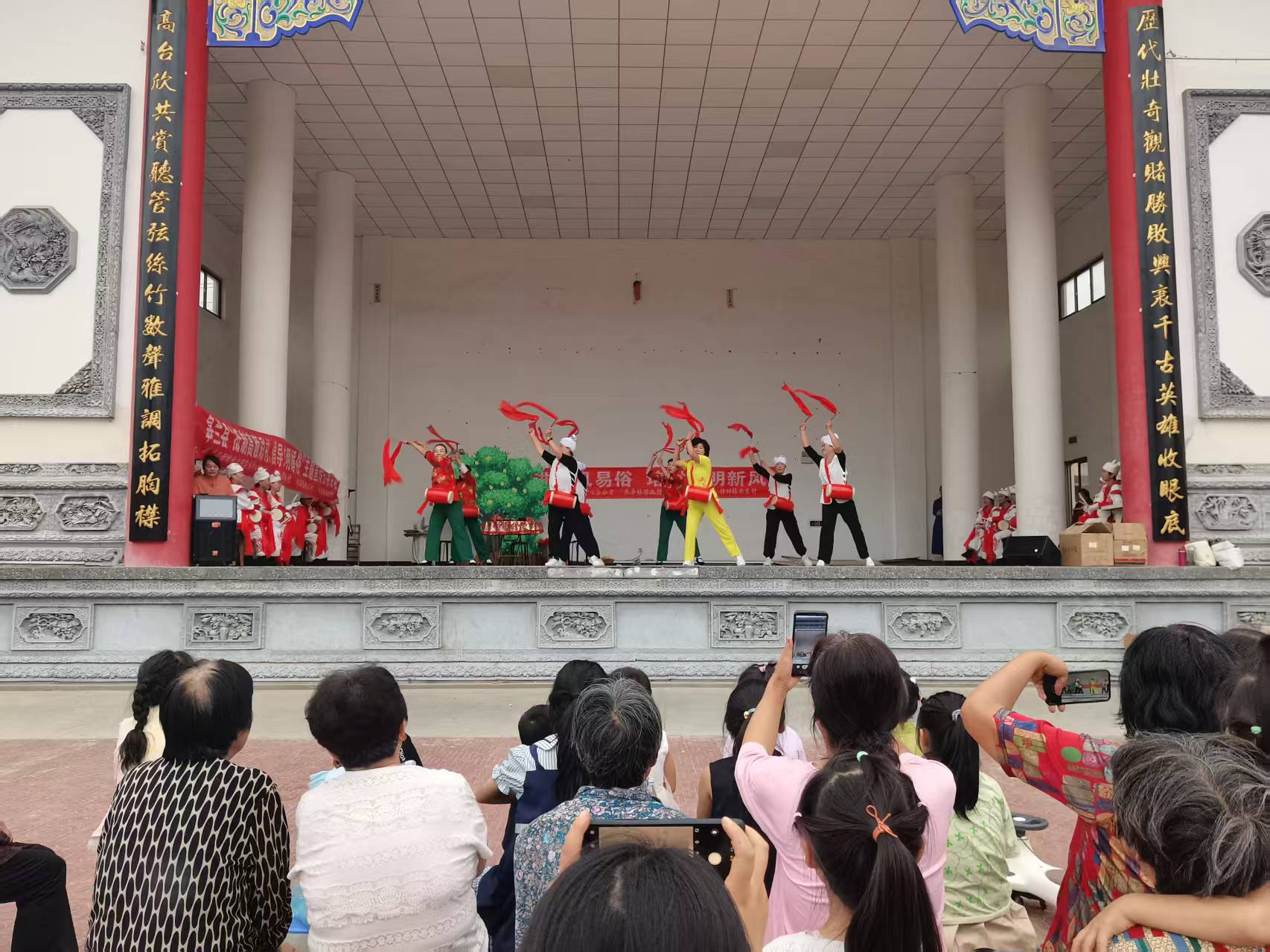 围着一张铺了红桌布的圆桌,在“好大东”的召集下,男女双方父母喜滋滋地讨论着孩子们的婚事。在这样的表演场景中,演员们略带方言却十分接地气的表演,以及朗朗上口的唱词,例如“我家女儿我心疼,嫁女不是卖物件,要的是真心换笑颜”,引得大家在热闹的氛围里沉浸式接受了一次文明的洗礼。